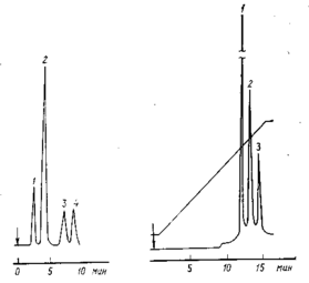 Рис. 1. Хроматограмма витаминов, полученная на колонке размером 300 Х 4 мм с µ-бондапаком C18, подвижная фаза – метанол – вода (70: 30) с 0,1% В7 и В5 (1:1), расход 1 мл/мин, детектор–УФ (254 нм): 1 – никотинамид; 2 – пиродоксин; 3 – рибофлавин; 4 – тиамин