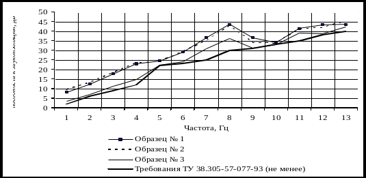 На рис.4 представлены результаты определения способности к звукоизоляции опытных образцов резинобитумных материалов, содержащих 5% (образец №1) и 8% (образец №2) некондиционной базальтовой ваты в сравнении с серийно применяемым образцом №3. Способность к звукоизоляции значительно выше уровня серийного материала. Так в диапазоне частот 400-800 Гц способность к звукоизоляции превышает в 1,5-2 раза, в остальном диапазоне преимущественно на 2-5 Дб.