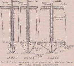 Искусственный способ. С целью увеличения крепости рассола, производят углубление скважин, при чем естественный рассол, опускаясь вниз и омывая нижележащие слои, донасыщается (каждые 10м углубления повышают крепость рассола примерно на 1г в литре и выше)