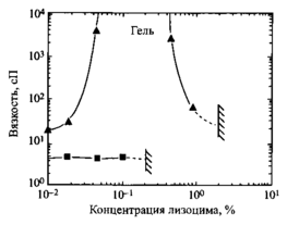 При введении в раствор лизоцима небольших добавок ДСН образуется нейтральный комплекс в виде твердого вещества, находящийся в равновесии с избытком белка в растворе. Количество осажденного белка достигает максимального значения, когда связывание ДСН лизоцимом становится равным 8 молекулам ДСН на одну молекулу белка, т.е. точно равным числу положительных зарядов в молекуле лизоцима. При значительном избытке ПАВ осадок растворяется. Чем короче алкильные цепи ПАВ, тем больше должна быть его концентрация для растворения осадка. Растворение осадка отвечает кооперативной части изотермы связывания в условиях, когда концентрация свободного ПАВ достигает KKM.