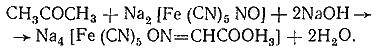 2. Реакция с нитропруссидом натрия. Ацетон с нитропруссидом натрия в щелочной среде дает интенсивно-красную окраску. При подкислении уксусной кислотой окраска переходит в красно-фиолетовую: