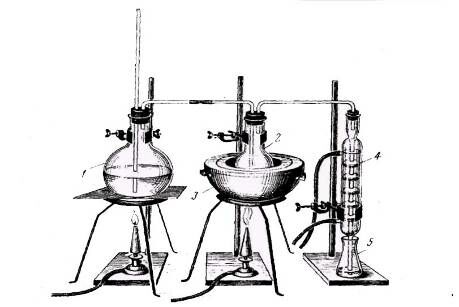1 – парообразователь; 2 – колба с объектом исследования; 3 – баня водяная; 4 – холодильник шариковый; 5 – приемник дистиллята.
