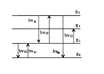 Горизонтальными линиями на рис.2.2.1. изображены уровни энергии различных состояний атома. Уровень Е0 это уровень основного состояния; Е1, Е2, Е3 - уровни возбуждённых состояний в порядке возрастания их энергии. Вертикальные стрелки соответствуют испусканию (стрелка вниз) или поглощению () фотона. Очевидно, что