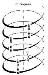 1) Альфа-спираль - имеет определенные характеристики: ширину, расстояние между двумя витками спирали. Для белков характерна правозакрученная спираль. В этой спирали на 10 витков приходится 36 аминокислотных остатков. У всех пептидов, уложенных в такую спираль, эта спираль абсолютно одинакова. Фиксируется альфа-спираль с помощью водородных связей между NH-группами одного витка спирали и С=О группами соседнего витка. Эти водородные связи расположены параллельно оси спирали и многократно повторяются, поэтому прочно удерживают спиралеобразную структуру. Более того, удерживают в несколько напряженном состоянии (как сжатую пружину).