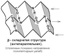 Бета-складчатая структура - или структура складчатого листа. Фиксируется также водородными связями между С=О и NH-группами. Фиксирует два участка полипептидной цепи. Эти цепи могут быть параллельны или антипараллельны. Если такие связи образуются в пределах одного пептида, то они всегда антипараллельны, а если между разными полипептидами, то параллельны.