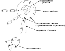 Чем больше гидрофильных свойств у белковой молекулы, чем больше в ее составе и на ее поверхности аминокислот с полярными (гидрофильными) радикалами, тем сильнее выражена и прочнее удерживается гидратная оболочка и тем больше в ней слоев. Вода гидратной оболочки обладает особыми свойствами: она не является свободной, а связана с белковой молекулой. Это - “связанная” вода. Она принадлежит белку, и поэтому имеет особые свойства.