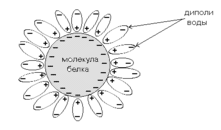 ГИДРАТНАЯ ОБОЛОЧКА - это слой молекул воды, определенным образом ориентированных на поверхности белковой молекулы. Поверхность большинства белковых молекул заряжена отрицательно, и диполи молекул воды притягиваются к ней своими положительно заряженными полюсами (смотрите рисунок).