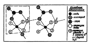 Рис. 11. Схема строения кристаллогидрата модного купороса. В рамку заключена одна молекула CuSО4 • 5H2О. Штрих означает, что молекула Н2О связана с двумя ионами кислорода и другой молекулой воды.