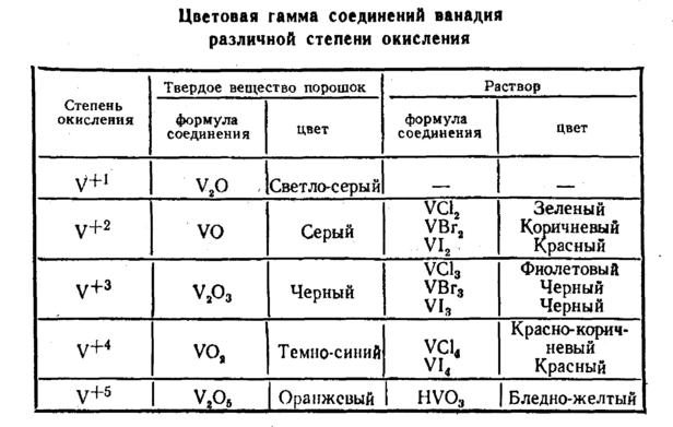 Степень окисления определяется состоянием валентных электронов. Каждой степени окисления соответствует свой цвет и свой характер. От голубого неустойчивого иона +2 с восстановительными свойствами до Сr6+ — окислителя проходит целая гамма цветов. Изменение свойств иона и изменение цвета имеют одну и ту же основу — определенное состояние электронов. Переход от одной степени окисления к другой делает электронную систему иона чувствительной к световым квантам строго определенной энергии, соответствующей разнице энергетических d-подуровней. Многообразие цвета ионных состояний одного и того же элемента доказывает, что это различие довольно тонкое. Подобные цветовые гаммы существуют и у других переходных элементов. В качестве примера приведем изменение цвета твёрдых соединений — оксидов и растворов галогенидов ванадия (табл. 2).