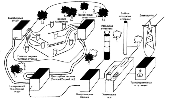 Процесс неуправляемого газообразования на полигонах бытовых и других отходов, содержащих большую долю органических компонентов, можно рассматривать как процесс получения метансодержащего газа в аккумулятивной системе, длительность процесса до полного разложения органической части здесь гораздо больше, чем в метатенках.