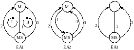 К линейным механизмам, как мы уже отмечали, относятся механизмы, все стадии которых в левой и правой частях уравнений стадий содержат не более, чем по одному интермедиату. Скорости таких стадий или не зависят, или линейно зависят от концентрации интермедиатов. Линейные механизмы естественным образом описываются кинетическими графами (КГ) Темкина. Вершины таких графов ставятся в соответствие интермедиатам, а ребра, связывающие вершины, – стадиям. Например, двухмаршрутный механизм каталитической реакции (М – катализатор)