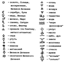 Алхимики использовали в своей деятельности различные металлы и вещества, каждому из которых соответствовал свой символ или знак. Однако надо учитывать, что в своих трактатах они описывали эти вещества различно, причем зачастую в одном и том же трактате одно и тоже вещество называлось по-разному. Это, прежде всего, относится к трем основным веществам используемых в делании: первовеществу, тайному огню и философской ртути.