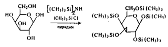 Моносахариды нелетучи и непосредственное разделение их смесей методом газожидкостной хроматографии невозможно. Сахара могут быть хроматографически разделены в виде летучих производных - простых и сложных эфиров. Широко распространен метод анализа в виде триметилсилильных производных моносахаридов. Последние являются летучими гликозидами простых О-триметилсилиловых эфиров углеводов, образующихся в результате полного замещения гидроксильных групп моносахаридов при их силировании.