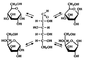В гидролизатах происходит мутаротация моносахаридов, т.е. образование равновесной смеси таутомерных форм: б-, в-пиранозных, б-, в-фуранозных и открытой. Для глюкозы это иллюстрирует следующая схема: