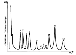В соответствии с tR на хроматограмме в определенном порядке появляются пики индивидуальных соединений. Xpoматограмма - совокупность пиков, соответствующая порядку выхода и массе индивидуальных компонентов смеси. Порядок выхода при хроматографическом разделении ТМС-производных зависит от жидкой фазы. Его устанавливают предварительно для данной фазы с использованием модельных ТМС-производных чистых моносахаридов по их времени удерживания. На рис. приведена в качестве примера хроматограмма модельной смеси, разделенной на колонке с метилхлорфенил-силиконовым маслом в качестве жидкой фазы.