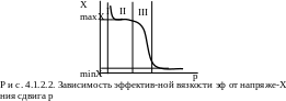 Для тиксотропного восстановления требуется время. Это время особенно велико у гелей (структурированных коллоидных растворов). Разрушение структуры в потоке являются причины понижения вязкости. При малых напряжениях структура фактически не разрушается и дисперсная система имеет постоянное увеличение вязкости, участок I. При полном разрушении вязкость достигает минимума и не зависит от напряжения, участок III рис. 4.2.2.2.