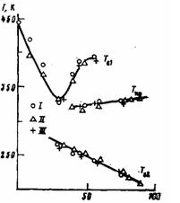 Рис. 2. Обобщенная диаграмма состояния блок-сополимеров I—III на основе ПАСО (М=4700), полученных различными способами в аналогичных условиях макродиизоцианата олигоэтиленоксида и олигоарилен-сульфоноксида с концевыми спиртовыми группами [7]