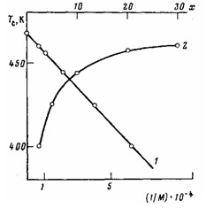Изучение фазового состояния блок-сополимеров ПАСО — ПЭО было начато с определения Тс олигоариленсульфоноксидов (литературные данные для которых отсутствуют) с целью установления зависимости Тс от значений их ММ. Полученные данные представлены на рис. 1 и являются типичными зависимостями Тс аморфных полимеров от ММ (степени поликонденсации х). С увеличением степени поликонденсации х температура стеклования ПАСО повышается сначала быстро, затем медленнее, стремясь к постоянному значению, равному Тс полимера с бесконечно большой длиной цепи. Экстраполяция зависимости Tc=f(i]M) на бесконечно большое значение ММ приводит к температуре 467 К, хорошо согласующейся с Тс полимера высокой степени поликонденсации. Значения температур стеклования ПАСО различной ММ были использованы для построения диаграмм состояния (зависимостей температур переходов от состава) для различных серий блок-сополимеров.
