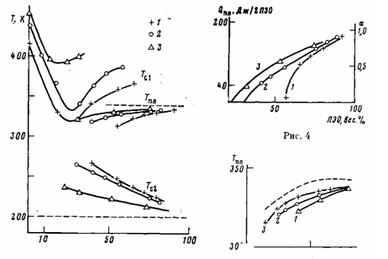 На рис. 3 приведены диаграммы состояния трех блок-сополимеров типа III на основе ПАСО различной ММ, сравнительное рассмотрение которых позволяет отметить следующее. При небольших содержаниях ПЭО в каждом ряду блок-сополимеров наблюдается лишь одна температура стеклования Тс1, отличная от температуры стеклования исходного ПАСО и резко снижающаяся при увеличении количества ПЭО. При некотором содержании ПЭО Тс2 перестает снижаться и наряду с ней появляется еще одна температура стеклования Тс2, существенно отличная от Те чистого ПЭО. Так же как и в случае блок-сополимеров ПА — ПЭО, Гс2 относится к стеклованию раствора жесткого блока (ПАСО) в ПЭО. Зависимости Тс2 от состава для разных рядов блок-сополимеров различны, но их экстраполяция на 100%-ное содержание ПЭО во всех случаях дает Тс чистого ПЭО большой ММ (~200 К) [8]. Дальнейшее увеличение содержания ПЭО сопровождается выделением кристаллической фазы ПЭО, характеризующейся температурой Тпл и теплотой плавления ()пл (рис. 4). Зависимости Тпл от состава для разных рядов блок-сополимеров различны: чем меньше молекулярная масса ПАСО-блока, тем больше их наклон. Так, в ряд блок-сополимера на основе ПАСО (М=13 500) максимальное снижение Тпл ПЭО-блока при уменьшении его количества составляет ~12 К, в то время как в ряду блок-сополимеров на основе ПАСО (М=1600) это снижение достигает ~20 К.