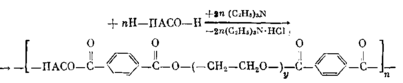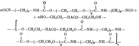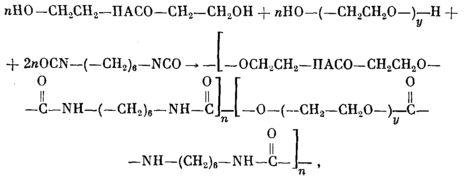 Регулярные блок-сополимеры с использованием в качестве удлинителей цепи гексаметилендиизоцианата (II) получали в две стадии в хлорбензоле при 353 К в присутствии 0,01% диэтилдикаприлата олова при взаимодействии заранее получен - от 1/М (1) и от степени поликонденсации х (2)