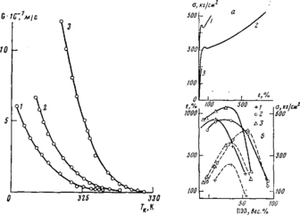 С целью сопоставления механических свойств блок-сополимеров различного состава были сняты кривые одноосного растяжения образцов при комнатной температуре и установлена существенная зависимость механических свойств от содержания ПЭО и степени его кристалличности а. Аналогичная зависимость была получена и для блок-сополимеров ПА — ПЭО в работе [5]. На рис. 8, а приведены типичные кривые растяжения образцов, составы которых находятся в характерных областях диаграммы состояния. На рис. 8, б представлены зависимости разрывной прочности и удлинения в зависимости от состава для трех рядов блок-сополимеров. Сравнительное рассмотрение рис. 8 и рис. 4 показывает следующее. Блок-сополимеры с малым содержанием ПЭО характеризуются типичными кривыми растяжения аморфного полимера в стеклообразном состоянии (кривая 1). Блок-сополимеры с большим содержанием ПЭО имеют (кривая 1) кривую растяжения пластифицированного аморфного полимера (кривая 2), но степень кристалличности их не превышает 50%. При достижении степени кристалличности ПЭО более 50% наблюдается резкое снижение прочностных свойств образцов и их хрупкое разрушение (кривая 3). Следует отметить, что блок-сополимеры на основе ПАСО (М=1600) обладают худшими механическими свойствами и хрупко разрушаются уже при малых значениях а.