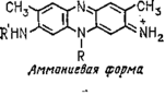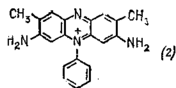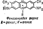 Это типичные основные красители, которые при сульфировании образуют кислотные красители. Сами по себе феназины бесцветны, но их четвертичные соли окрашены достаточно интенсивно. Технология азиновых красителей была разработана в период 1880—1900 г.г. усилиями Витта, Каро, Штраубе, Герпа и других. В результате этих работ появились эуродин и сафранин (N-алкил- и фенилпроизводные феназинов), а также более сложные по строению индулины и нигрозины. Химическая структура этих красителей была выяснена значительно позже, в 20-х годах нашего столетия, благодаря исследованиям Керманна, но сама технология не претерпела существенных изменений со времени первооткрывателей, за исключением некоторых новых красителей, полученных уже 1900-х годах. До настоящего времени многие из этих красителей имеют важное техническое и коммерческое значение. Достаточно сказать, что в США производство только одного нигрозина, применяемого для типографских красок, лент пишущих машин, кремов для обуви и т. д., достигает 4 тыс. т в год. —Строение самого простого сафранинового красителя ярко-красного цвета, сафранина Б, показано формулой.
