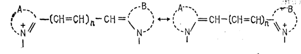 Здесь п=0 или четному числу, пунктиром обозначены гетероциклические кольца. Один из атомов азота несет положительный заряд и является электроноакцепторным. Таким образом, через систему сопряженных двойных связей осуществляется донорно-акцепторное взаимодействие с другим донорным атомом азота.