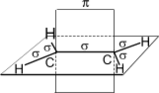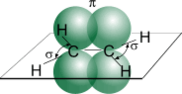 В результате каждый атом углерода обладает тремя гибридными sp2 -орбиталями, оси которых находятся в одной плоскости под углом 120º друг к другу, и одной негибридной гантелеобразной p-орбиталью, ось которой расположена под прямым углом к плоскости осей трех sp2 -орбиталей. Одна из трех гибридных орбиталей атома углерода перекрывается с подобной орбиталью другого атома углерода, образуя - связь. Каждая оставшаяся гибридная орбиталь атомов углерода перекрывается с s- орбиталью атомов водорода, приводя к образованию в той же плоскости четырех - связей C–H. Две негибридные p- орбитали атомов углерода взаимно перекрываются и образуют - связь, максимальная плотность которой расположена перпендикулярно плоскости - связей. Следовательно, двойная связь алкенов представляет собой сочетание - и - связей.