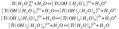 В растворах титан может находиться в форме простых и комплексных ионов, а также в коллоидно-дисперсном состоянии. Превалирование той или иной формы зависит от условий получения и хранения раствора, его концентрации, содержания примесей и других факторов. Способность Ti вступать в типичные ионные реакции, например в окислительно-восстановительные, свидетельствует о том, что в растворах сернокислые соли диссоциирует на катионы и анионы. Так, превращение сульфата в хлорид при добавлении BaCl2: