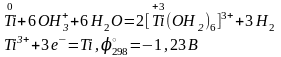 Растворы титана. В водных растворах Ti находится преимущественно в 4-валентном состоянии, но в определенных условиях существуют комплексы, в которых валентность титана равна трем. Малый ионный радиус позволяет ему приобретать заметную долю электронной плотности кислородного донора с образованием прочной ковалентной связи. Значения электроотрицательности для TiOH и TiO – 2,43 и 2,56 соответственно. Сродство ионов Ti+4 настолько велико, что комплексы практически всегда содержат кислород и образуют в растворах титана(IV) цепи с гидроксильными и кислородными мостиками.