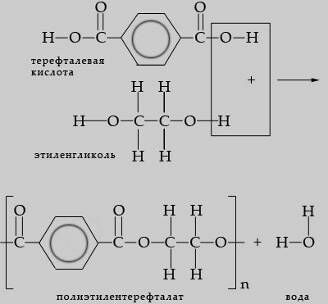 Полиэтилентерефталат является продуктом поликонденсации терефталевой кислоты (OH)-(CO)-C6H4-(CO)-(OH) и моноэтиленгликоля (OH)-C2H4-(OH). В процессе поликонденсации образуется линейная молекула полиэтилентерефталата [-O-(CH2)2-O-(CO)-C6H4-(CO)-] n и вода. Молекулярная масса полиэтилентерефталата 20-40 тыс.