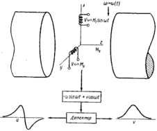 Рис. 2.1. Система датчика сигналів ЯМР на двух котушках. Передаюча котушка, що розташована вздовж осі х, живиться напругою з частотою ω , що лінійно змінюється в часі. Приймаюча котушка, розташована вздовж осі у, приймає компоненту ядерної намагніченості Мy. Фазовий детектор виділяє обі складові Му — дисперсію
