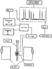 . Крім того, спектрометр повинен містити систему розгортки (наприклад, по частоті), підсилювачі по високій частоті та по частотам модуляції, а також пристрій для реєстрації сигналів ЯМР, наприклад самопишучий потенціометр, на одну вісь якого подається напруга сигналу, а на іншу — напруга, пропорційна частоті розгортки (при частотному свипі). Розуміється, «серцем» усієї системи є зразок, що являє собою ампулу, що містить ядра досліджуваного типу.4