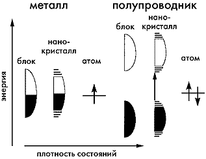 Заполнение электронных уровней в металле и полупроводнике. Энергетическая зона металла, независимо от размера его частиц, заполнена не вся, поэтому электроны могут переходить на более высокие уровни. У полупроводника же валентная зона заполнена целиком и отделена от зоны проводимости на 2—3 эВ. Из-за малых размеров полупроводниковых нанокристаллов эти зоны расщепляются, что приводит к эффективному увеличению ширины запрещенной зоны (до 4.5 эВ).