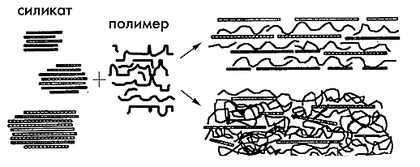 Слоистые нанокомпозиты на основе алюмосиликата и поли мера с низким его содержанием (справа вверху) и высоким.