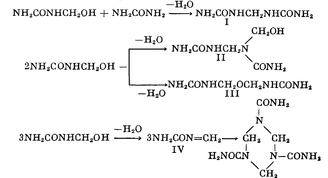 Моно- и диметилолмочевины – белые кристаллические продукты, растворимые в воде и метаноле; первый плавится при 111 °С (из этанола), второй – при 121 – 126 °С (из 80%-ного этанола); диметилолмочевина при нагревании растворяется также в этаноле. При нагревании безводные моно- и диметилолмочевины превращаются в полиметиленмочевины; первая полностью переходит в нерастворимый продукт при 100 °С, вторая – выше 140 °С. В водных кислых растворах (рН 4.5–6.0) метилолмочевина способна к дальнейшим превращениям с образованием, вероятно, метилен-бис-амида (I), метилолметилен-бис-амида (II) или простого эфира (III) и азометилена (IV), который сразу же тримеризуется: