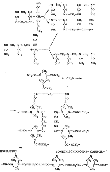 Механизм образования мочевино-формальдегидных смол сложен. Всегда в качестве начального продукта образуется моно- и диметилолмочевина, которые при дальнейшей поликонденсации в слабокислой среде дают линейные полимеры.