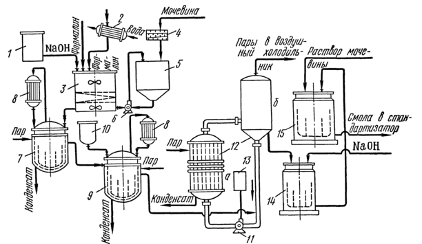 Технологический процесс производства мочевино-формальдегидной смолы осуществляется жидкофазным непрерывным методом и состоит из следующих основных стадий: подготовка сырья; приготовление реакционного раствора; конденсация в щелочной и кислой средах; нейтрализация и сушка смолы; доконденсация смолы с мочевиной; охлаждение, стабилизация и стандартизация смолы.