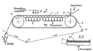 Осадок благодаря вакууму подсушивается и при перегибе ленты через валик 7 отделяется от ткани и сбрасывается в бункер. На обратном пути между роликами б фильтровальная ткань обычно регенерируется: очищается с помощью механических щеток, пропаривается или промывается жидкостью.