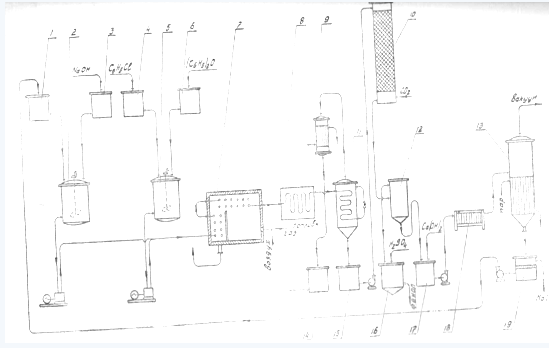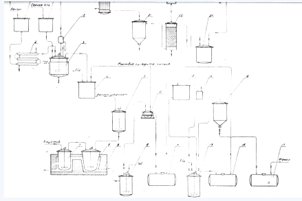 Фенол передавливается в отстойник для фенола-сырца 16, оттуда стекает в сборник фенола 17 и уходит на перегонку (на схеме не указано).