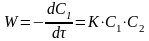 Швидкість реакції (1) визначається зміною концентрації реагентів за одиницю часу. Для реакцій, що протікають при постійному об'ємі в закритих системах, швидкість реакції виражають рівнянням