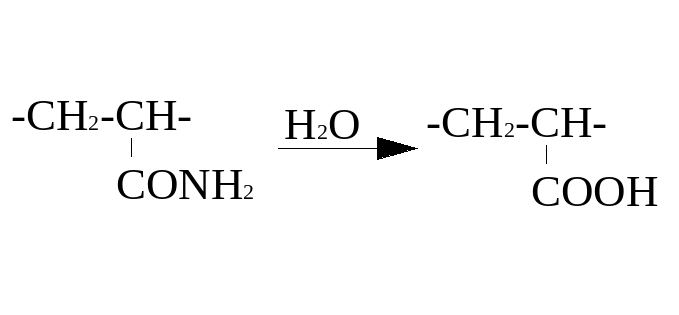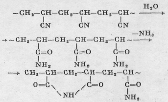 Полиакрилонитрил омыляется H2SO4 конц. (75–95%-ная) на холоду; образуется хлопьевидный продукт белого цвета с молекулярной массой 62% от исходной, содержащий амидные (молярная концентрация до 90%) и имидные звенья: