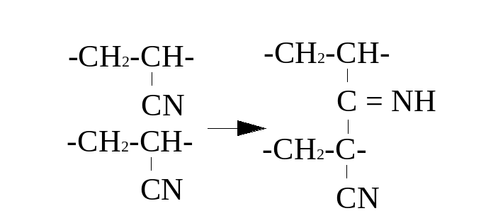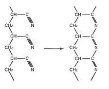Полиакрилонитрил при нагревании изменяет свой цвет, причем этот процесс всегда сопровождается потерей растворимости. Предполагается, что изменение окраски связано с образованием азометиновых мостиков между соседними макромолекулами, чему благоприятствует сильное притяжение, существующее между атомом азота и подвижным атомом водорода, находящимся в