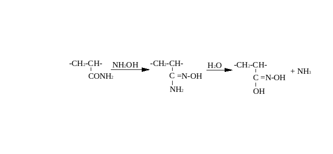 При обработке полиакриламида раствором соды степень омыления достигает 30–40%. По деструктивному действию омыляющие агенты можно расположить в следующий возрастающий ряд: NaOH (1%-ный), НС1, НСООН, Na2CO3, H2SO4, H3PO4. При взаимодействии полиакрилонитрила с гидроксиламином при 50–100°С протекает реакция образования амидоксимных групп с последующим выделением аммиака и образованием групп гидроксамовой кислоты: