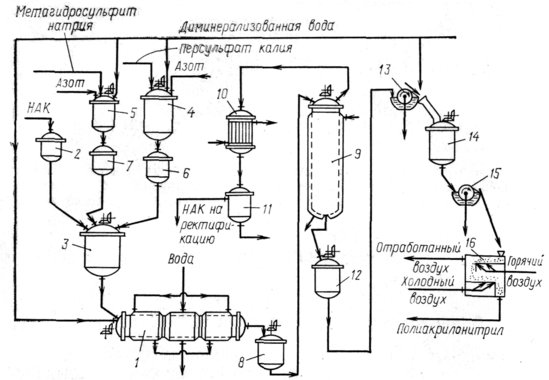 Непрерывный технологический процесс получения полиакрилонитрила состоит из стадий приготовления растворов, полимеризации акрилонитрила, демономеризации дисперсии и конденсации акрилонитрила, фильтрации, промывки и сушки полимера.