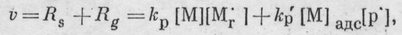 р – константы скоростей роста соответственно в водном растворе акрилонитрила и на глобулах полиакрилонитрила; [М] – концентрация акрилонитрила в водном растворе; [М]адс – эффективная концентрация акрилонитрила, адсорбированного на глобулах; [М'р] – концентрация свободных радикалов в растворе; [р-] – концентрация глобул в реакционной смеси.
