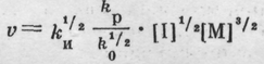 где kи, kp, k0 – константы скорости соответственно инициирования, роста и обрыва; [I] – концентрация инициатора (или мощность дозы радиации); [М] -, концентрация мономера.