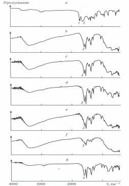 Рис. 6. ИК-Спектры ацетилацетона (а) и золей диоксида титана, полученных в присутствии ацетилацетона в различных органических растворителях: в ТГФ (b), ацетоне (с), бутаноле (d), хлороформе (e), толуоле (f), гексане (g). 1 — пик группы С=0 кето-формы, 2 — пик группы С = 0 енольной формы, 3 — пик группы С=0 хелатного комплекса.