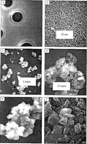 Рис. 7. СЭМ-Микрофотографии золей диоксида титана, полученных в присутствии ацетилацетона в среде ацетона (а), бута-нола (6), толуола (c,e) и гексана (d,f) Снимки e и f получены при большем увеличении.