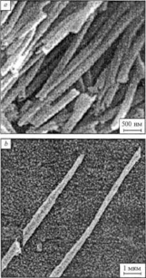 Синтез наноразмерного Ti02 золь-гель-методом на основе изопропоксида титана может быть проведен в присутствии другой добавки — пептида поли-L-лизина (PLL). В этом случае пептид является не только диспергирующей, но и структуроопределяющей добавкой: лишь в присутствии PLL образуются частицы TiO2 трубчатой формы (рис.8,a). Такая форма частиц сохраняется и после прокаливания при 700°С (рис.8,b). Прокаливание при той же температуре образца, полученного без пептида PLL, приводит к диоксиду титана с нерегулярной структурой (рис.9). По данным РФА, диоксид титана, полученный в присутствии PLL и прокаленный при 700°С, представляет собой анатаз с примесью рутила. На микрофотографиях, сделанных методом ПЭМ, наночастицы с дифракционной картиной анатаза проявляются в виде спаренных трубок диаметром около 20 нм с Y-образным сцеплением в нижней части или в форме наностержней диаметром от 10 до 25 нм. [3,946] Материалы на основе наноразмерного ТiO2 с трубчатой структурой могут быть успешно использованы в медицине, биотехнологии, микроэлектронике, оптике и др.[3, 947]